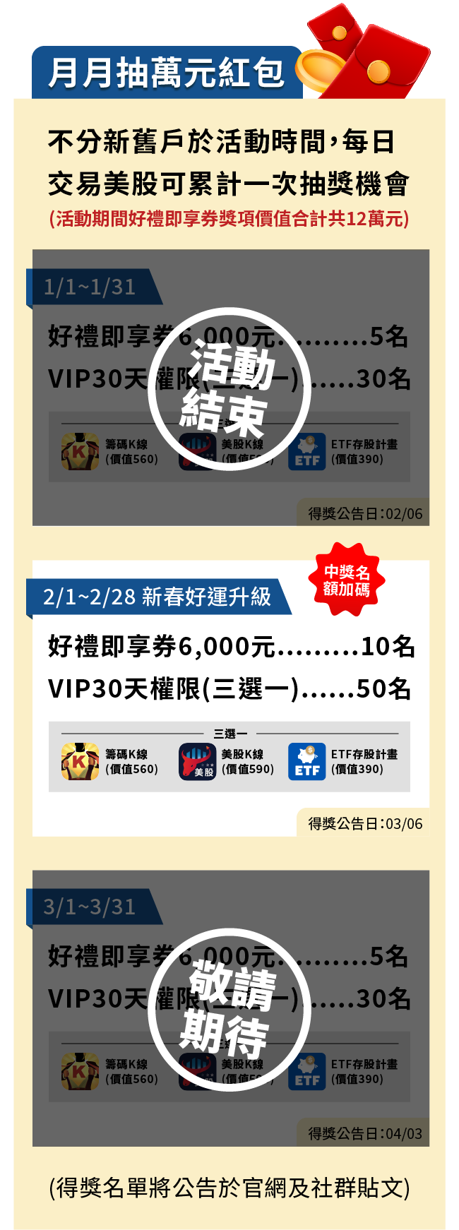 7. 美股交易抽- 籌碼K線/美股K線/ETF 存股計畫 VIP30天權限 (三選一) | 6,000元好禮即享券-頂規好禮組(無效期) :
