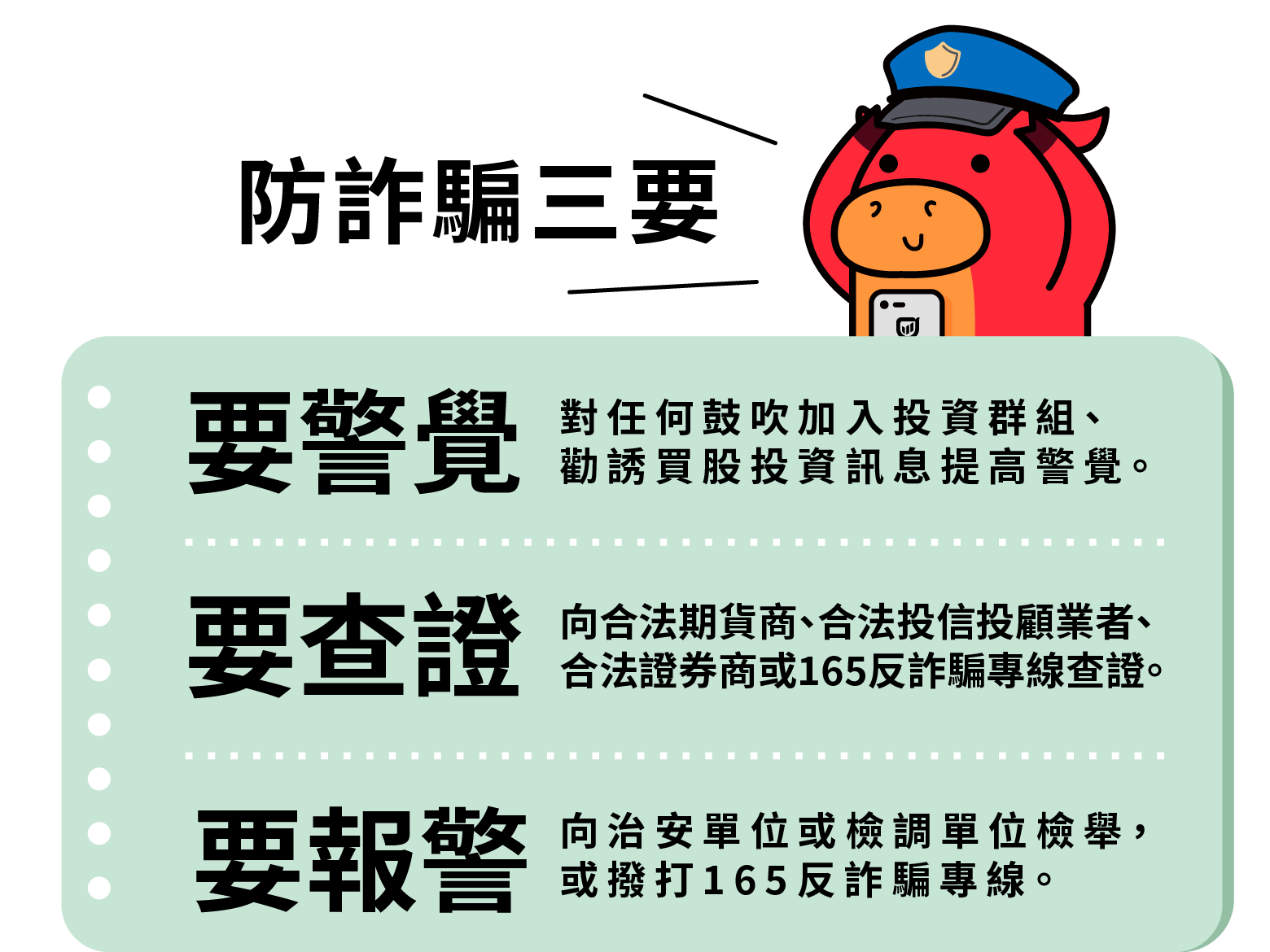 鑑於近年投資詐欺案件數及財損金額仍居於各類詐騙案件之首,為保護投資人權益,切勿輕信並點選不明之電話、簡訊、電子郵件、手機通訊軟體或社群媒體廣告網站連結及安裝不明程式,更勿進一步匯款、交付財物或提供個資以維護自身權益及保障財產安全,務必確實採取停、看、查三個步驟,杜絕所有可能的金融詐騙。一旦發現有疑慮的訊息時,請撥打「165」反詐騙諮詢專線,亦可透過本公司 LINE官方帳號 或 撥打反詐騙專線0809-089-001查詢,以確保自身權益。